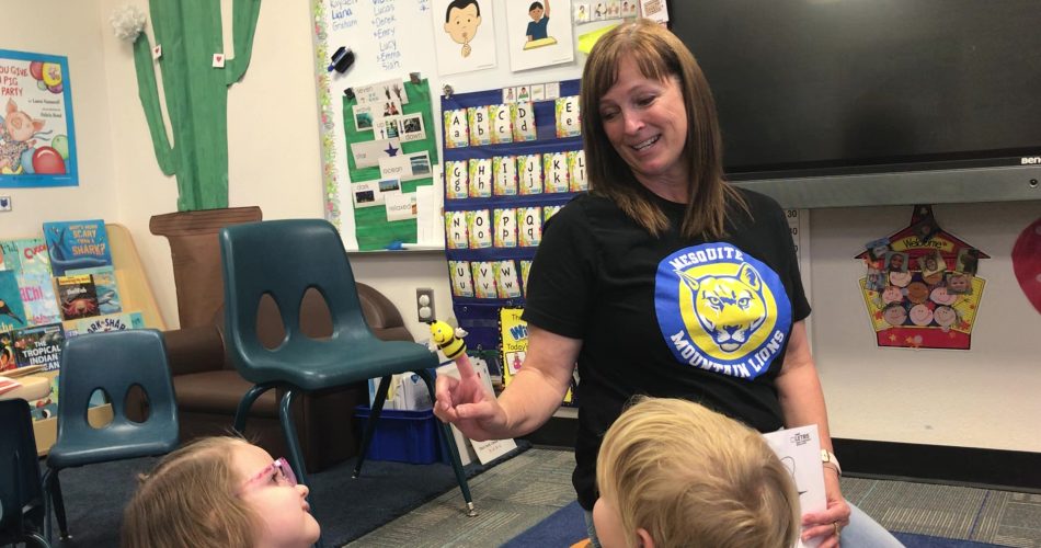 As a group of preschoolers gather on a rug, their teacher holds up a card with the letter D and says, “I wonder what would happen if we changed the first sound of our name to a D sound. I’m going to go first. Instead of Mrs. Powers, I would be “Mrs…“ She pauses and
