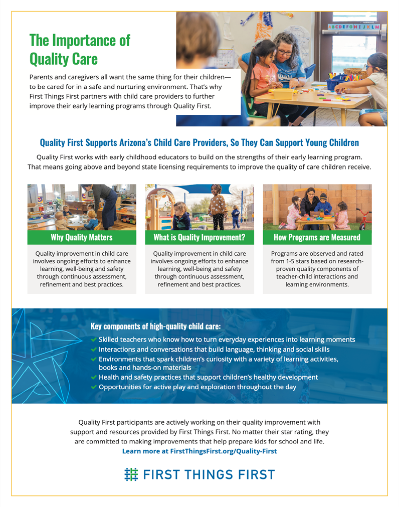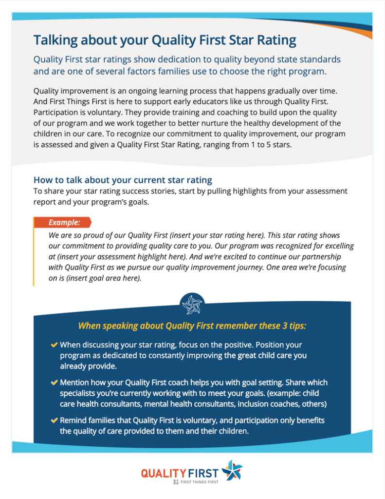This printable flyer explains your partnership with First Things First and what your star rating means. It helps families understand the value of high-quality child care.
